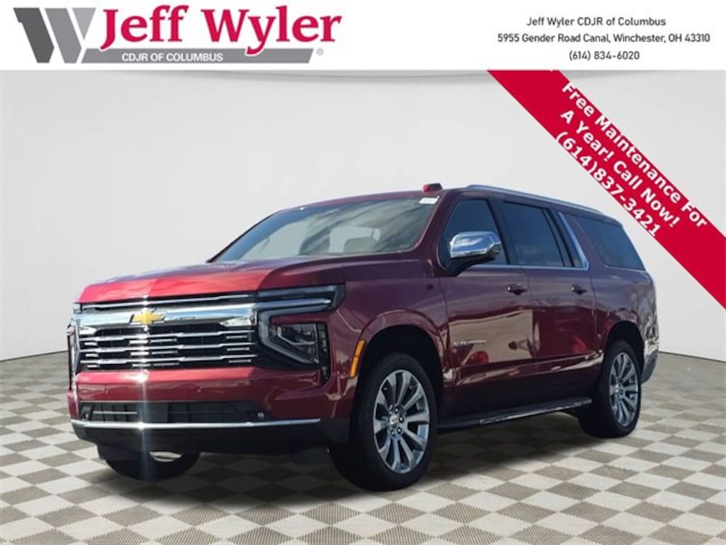 Jeff Wyler Columbus Auto Mall is excited to offer this wonderful-looking 2025 Chevrolet Suburban Premier in Radiant Red Tintcoat. Well equipped with: Preferred Equipment Group 1LZ (20 x 9 Polished Aluminum Wheels, 3rd Row 60/40 Power-Folding Split-Bench, 4-Way Power Driver Lumbar Seat Adjuster, 4-Way Power Front Passenger Lumbar Seat Adjuster, 8-Way Power Front Passenger Seat Adjuster, Auto-Dimming Inside Rear-View Mirror, Bose 10-Speaker Surround with CenterPoint, Bright Front and Rear Door Sill Plates, Chrome Door Handles with Body-Color Strip, Dual Exhaust System, Front LED Fog Lamps, Heated 2nd Row Outboard Seats, Heated Driver and Front Passenger Seats, Heated Power-Adjustable Outside Mirrors, Heated Steering Wheel, LED Headlamps with LED Daytime Running Lamps, LED Tail Lamps, Magnetic Ride Control Suspension, Memory Settings, Perforated Heated and Ventilated Seats, Power Release 2nd Row Bucket Seats, Power Tilt and Telescopic Steering Column, Power-Sliding Center Floor Console, Rear Power Liftgate, Universal Home Remote, and Wireless Phone Charging), 10 Speakers, 3.23 Rear Axle Ratio, 3rd row seats: split-bench, 4-Wheel Disc Brakes, 8-Way Power Driver Seat Adjuster, ABS brakes, Adaptive suspension, Air Conditioning, Alloy wheels, AM/FM radio: SiriusXM with 360L, Apple CarPlay/Android Auto, Auto High-beam Headlights, Auto-dimming door mirrors, Auto-dimming Rear-View mirror, Auto-leveling suspension, Automatic temperature control, Brake assist, Bumpers: body-color, Compass, Delay-off headlights, Driver door bin, Driver vanity mirror, Dual front impact airbags, Dual front side impact airbags, Electronic Stability Control, Emergency communication system: OnStar Services capable, Exterior Parking Camera Rear, Four wheel independent suspension, Front anti-roll bar, Front Bucket Seats, Front Center Armrest, Front dual zone A/C, Front fog lights, Front reading lights, Fully automatic headlights, Garage door transmitter, Heated door mirrors, Heated front seats, Heated rear seats, Heated steering wheel, Illuminated entry, Low tire pressure warning, Memory seat, Navigation system: Google built-in compatibility (select service plan required, terms and limitations apply), Occupant sensing airbag, Outside temperature display, Overhead airbag, Overhead console, Panic alarm, Passenger door bin, Passenger vanity mirror, Perforated Leather Seating Surfaces, Power door mirrors, Power driver seat, Power Liftgate, Power passenger seat, Power steering, Power windows, Radio data system, Radio: 17.7 Diagonal Advanced Color LCD Display, Rain sensing wipers, Rear air conditioning, Rear anti-roll bar, Rear reading lights, Rear window defroster, Rear window wiper, Remote keyless entry, Security system, SiriusXM with 360L Trial Subscription, Speed control, Speed-sensing steering, Split folding rear seat, Spoiler, Steering wheel memory, Steering wheel mounted audio controls, Tachometer, Telescoping steering wheel, Tilt steering wheel, Traction control, Trip computer, Turn signal indicator mirrors, Variably intermittent wipers, Ventilated front seats, Voltmeter, Wheel Locks (set of 4), Wheels: 22 x 9 Manoogian Silver Painted Aluminum, and Wireless Apple CarPlay/Wireless Android Auto.