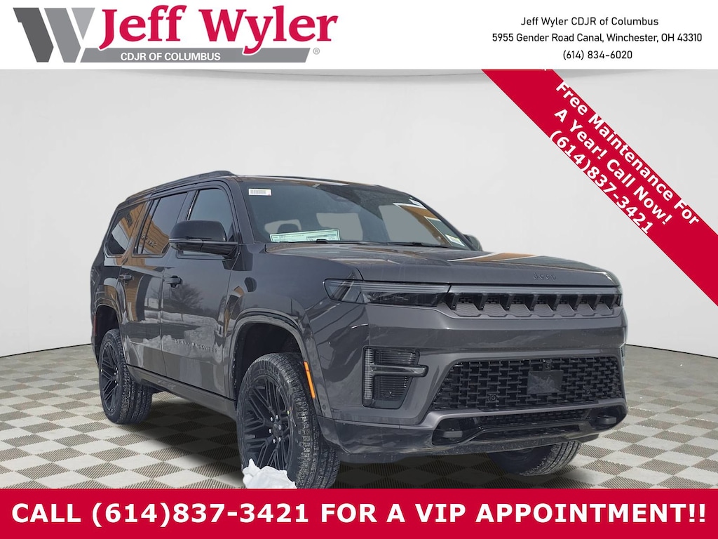 Jeff Wyler Columbus Auto Mall is pleased to offer this beautiful 2026 Jeep Grand Wagoneer Limited in Baltic Gray Metallic Clearcoat. Well equipped with: Black Appearance Package (118 Mph Maximum Speed Calibration, Black Exterior Accents, Titanium Daylight Opening Upper, Titanium Upper Grille Applique, and Wheels: 22" x 9" Painted Gloss Black), HD Trailer Tow Package (Adjustable Roof Rail Crossbars, Blind Spot with Trailer Detection, Electronic Rear Limited Slip Differential, Removable Rear Tow Hooks, Selec-Speed Control, Trailer Brake Control, Trailer Hitch Zoom, Trailer Light Monitoring, and Vapor Tow Hooks), Limited Reserve Package, Quick Order Package 29D Reserve (19 Speaker McIntosh Audio System, 2nd Row Manual Window Shades, 3 Panel Sunroof, Cargo Cover, Cluster 12" TFT Color Display, Heads-Up Display, Instrument Panel, Interior Rear Facing Camera, Luxury Front and Rear Floor Mats, P and P Park and Unpark Assist with Stop System, Power Deployable Running Boards, Quadra-Lift Air Suspension, Reversible Carpet/Vinyl Cargo Mat, Semi Active Damping, Side Distance Warning, Smartphone as a Key Prep, and Surround View Camera System), 3rd row seats: bench, 4-Wheel Disc Brakes, 9 Speakers, ABS brakes, Air Conditioning, Alloy wheels, AM/FM radio: SiriusXM with 360L, Anti-whiplash front head restraints, Apple CarPlay/Android Auto, Audio memory, Auto Adjust in Reverse Exterior Mirrors, Auto High-beam Headlights, Auto-dimming door mirrors, Auto-Dimming Exterior Driver Mirror, Auto-dimming Rear-View mirror, Auto-leveling suspension, Automatic temperature control, Brake assist, Bumpers: body-color, Compass, Delay-off headlights, Driver door bin, Driver vanity mirror, Driver's Seat Mounted Armrest, Dual front impact airbags, Dual front side impact airbags, Electronic Stability Control, Emergency communication system: Jeep Connect, Exterior Mirrors Approach Lamps, Exterior Mirrors with Memory, Exterior Mirrors with Supplemental Signals, Exterior Parking Camera Rear, Four wheel independent suspension, Front anti-roll bar, Front Bucket Seats, Front Center Armrest w/Storage, Front dual zone A/C, Front fog lights, Front reading lights, Fully automatic headlights, Garage door transmitter, Heated door mirrors, Heated Exterior Mirrors, Heated front seats, Heated rear seats, Heated steering wheel, Illuminated entry, Knee airbag, Leather Trimmed Bucket Seats, Low tire pressure warning, Memory seat, MyFlexCare Service Plan, Navigation System, Normal Duty Suspension, Occupant sensing airbag, Outside temperature display, Overhead airbag, Overhead console, Panic alarm, Passenger door bin, Passenger seat mounted armrest, Passenger vanity mirror, Power door mirrors, Power driver seat, Power Liftgate, Power passenger seat, Power steering, Power windows, Radio data system, Radio: Uconnect 5 Nav with 12.0" Display, Rain sensing wipers, Rear air conditioning, Rear anti-roll bar, Rear reading lights, Rear seat center armrest, Rear window defroster, Rear window wiper, Reclining 3rd row seat, Remote keyless entry, Security system, Speed control, Speed-sensing steering, Speed-Sensitive Wipers, Split folding rear seat, Steering wheel memory, Steering wheel mounted audio controls, Tachometer, Telescoping steering wheel, Tilt steering wheel, Traction control, Trip computer, Turn signal indicator mirrors, Variably intermittent wipers, Ventilated front seats, Ventilated rear seats, and Voltmeter.Wyler Family First Package Includes: NanoCure Appearance Protection: Exterior & Interior Chemical Sealant Applied to Protect Against Environmental Hazards (7 Year Warranty Coverage). Pulse- Rear End Collision Avoidance System Theft Deterrent Strategy gives you 5 Years of Coverage against vehicle theft, Offering up to a $5,000 benefit. Price does not include Tax, Title, License and Documentary Fee$500 - 2026 National 2026 Military Bonus Cash . Exp. 01/04/2027 $2000 Stellantis Financial Bonus Cash. Must finance through SFS to receive discount.