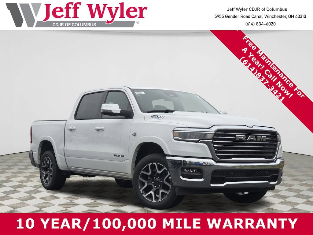 Jeff Wyler Columbus Auto Mall is pumped up to offer this attractive 2026 Ram 1500 Laramie in Bright White Clearcoat. Well equipped with: Bed Utility Group (Exterior 115V AC Outlet, MOPAR 4 Adjustable Cargo Tie-Down Hooks, and MOPAR Spray in Bedliner), Laramie Level 1 Equipment Group (Rain Sensitive Windshield Wipers and Remote Tailgate Release), Quick Order Package 27H Laramie, 10 Speakers, 4-Wheel Disc Brakes, 4G LTE Wi-Fi Hot Spot, ABS brakes, Active Noise Control System, Adjustable pedals, Air Conditioning, Alloy wheels, AM/FM radio: SiriusXM with 360L, Apple CarPlay/Android Auto, Audio memory, Auto High-beam Headlights, Auto Power-Folding Mirrors, Auto-dimming door mirrors, Auto-Dimming Exterior Driver Mirror, Auto-dimming Rear-View mirror, Automatic temperature control, Brake assist, Bumpers: chrome, Chrome Exterior Mirrors, Compass, Connected Travel and Traffic Services, Connectivity - US/Canada, Convex Wide-Angle Exterior Mirror Insert, Delay-off headlights, Driver door bin, Driver vanity mirror, Dual front impact airbags, Dual front side impact airbags, Electronic Stability Control, Exterior Mirrors Courtesy Lamps, Exterior Mirrors with Heating Element, Exterior Mirrors with Memory, Exterior Mirrors with Supplemental Signals, Front anti-roll bar, Front Bucket Seats, Front Center Armrest w/Storage, Front dual zone A/C, Front fog lights, Front reading lights, Front wheel independent suspension, Fully automatic headlights, Garage door transmitter, GPS Navigation, Heated door mirrors, Heated front seats, Heated rear seats, Heated steering wheel, Illuminated entry, Integrated Center Stack Radio, Integrated Voice Command with Bluetooth, Leather steering wheel, Leather Trimmed Bucket Seats, Low tire pressure warning, Memory seat, MOPAR Front and Rear Rubber Floor Mats, Navigation System, Occupant sensing airbag, Off-Road Information Pages, Outside temperature display, Overhead airbag, Overhead console, Panic alarm, ParkView Rear Back-Up Camera, Passenger door bin, Passenger vanity mirror, Pedal memory, Power door mirrors, Power driver seat, Power passenger seat, Power steering, Power windows, Radio data system, Radio: Uconnect 5 Navigation with 12.0" Display, RAM Grille Badge - Chrome, Rear anti-roll bar, Rear reading lights, Rear seat center armrest, Rear step bumper, Remote keyless entry, Security system, SiriusXM Radio Service, SiriusXM with 360L, Speed control, Split folding rear seat, Steering wheel mounted audio controls, Tachometer, Telescoping steering wheel, Tilt steering wheel, Traction control, Trip computer, Turn signal indicator mirrors, USB Host Flip, Variably intermittent wipers, Ventilated front seats, Voltmeter, and Wheels: 20" x 9" Premium Paint/Polish.Wyler Family First Package Includes: NanoCure Appearance Protection: Exterior & Interior Chemical Sealant Applied to Protect Against Environmental Hazards (7 Year Warranty Coverage). Pulse- Rear End Collision Avoidance System Theft Deterrent Strategy gives you 5 Years of Coverage against vehicle theft, Offering up to a $5,000 benefit. Price does not include Tax, Title, License and Documentary Fee$1000 - 2026 National Bonus Cash . Exp. 03/02/2026 $3500 - 2026 National Retail Consumer Cash . Exp. 03/02/2026 $500 - 2026 Great Lakes BC Truck Month Bonus Cash . Exp. 03/02/2026 $500 - 2026 National 2026 Military Bonus Cash . Exp. 01/04/2027 $2000 Stellantis Financial Bonus Cash. Must finance through SFS to receive discount.