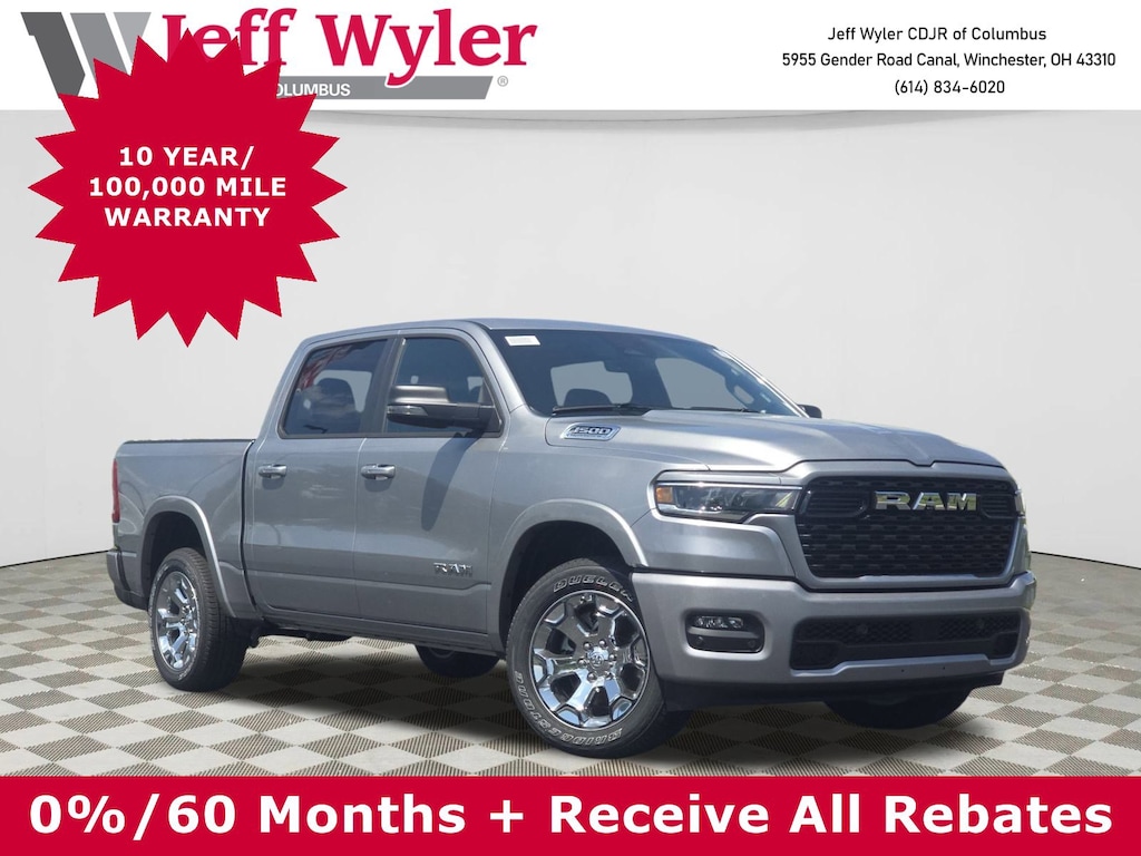 Experience the All-New 2026 RAM 1500 Big Horn in Stunning Billet Silver!This powerhouse pickup combines rugged capability with premium comfort. The twin-turbo Hurricane 3.0L I-6 engine delivers an impressive 420HP while maintaining excellent fuel efficiency. Standout features include the massive 12" touchscreen with integrated navigation, dual-pane panoramic sunroof, and wireless device charging pad. Safety You Can Trust: Advanced safety technologies include Forward Collision Warning-Plus, Blind Spot Detection, Active Lane Management, and Pedestrian Emergency Braking for complete peace of mind. Incredible Value: Take advantage of $4,000 in national incentives, plus our competitive pricing makes this premium truck an exceptional deal.Premium Comfort Features: Heated leather-wrapped steering wheel & front seats 8-way power driver seat with lumbar support Dual-zone automatic climate control 4G LTE Wi-Fi hotspotWork-Ready Capability: MOPAR spray-in bedliner & tie-down hooks 115V power outlets (interior & bed) Remote tailgate release Why Choose Jeff Wyler Columbus? With over 45 years serving Central Ohio, we're your trusted RAM dealer offering exceptional service, competitive pricing, and the largest selection in the region. Price does not include Tax, Title, License and Documentary Fee$3500 - 2026 National Retail Bonus Cash . Exp. 04/30/2026 $500 - 2026 National 2026 Military Bonus Cash . Exp. 01/04/2027