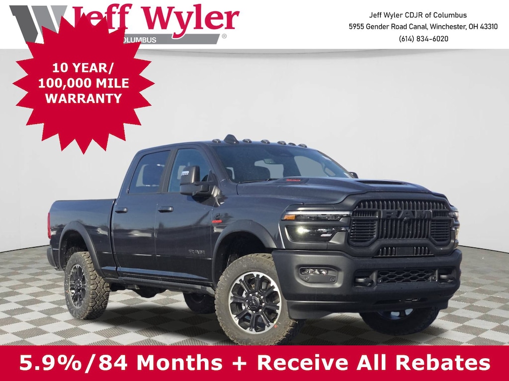 Jeff Wyler Columbus Auto Mall is pumped up to offer this beautiful 2026 Ram 2500 Rebel in Forged Blue Metallic. Well equipped with: Bed Utility Group (LED Bed Lighting, MOPAR Deployable Bed Step, and MOPAR Spray in Bedliner), Cold Weather Group (Engine Block Heater and MOPAR Winter Front Grille Cover), Quick Order Package 24R Rebel, Rebel Level 1 Equipment Group (2 Way Rear Headrest Seat, 4 Way Front Headrests, 9 Alpine Speakers with Subwoofer, Auto Adjust in Reverse Exterior Mirrors, Auto Dim Exterior Mirror, Auto High Beam Headlamp Control, Auto Power-Folding Mirrors, Auto-Dimming Exterior Passenger Mirror, Black Exterior Mirrors, Body Color Door Handles, Exterior Mirrors Courtesy Lamps, Exterior Mirrors with Heating Element, Exterior Mirrors with Memory, Exterior Mirrors with Supplemental Signals, Folding Flat Load Floor Storage, Forward and Reverse Utility Lights, Front Door Locks 2-Door Passive Entry, Heated Front Seats, Heated Steering Wheel, High Back Seats, LED Dome Lamp with on/Off Switch, LED Interior Lighting, Mirror Running Lights, MOPAR Front and Rear Rubber Floor Mats, Overhead LED Lamps, Power 2-Way Driver Lumbar Adjust, Power Adjust 8-Way Driver Seat, Power Adjust Mirrors, Power Adjustable Pedals with Memory, Power Heated Fold Telescopic Mirrors with Memory, Power Telescoping Mirrors, Power-Adjustable Convex Aux Mirrors, Premium Overhead Console, Rain Sensitive Windshield Wipers, Rear 60/40 Folding Seat, Sport Performance Hood, Sun Visors with Illuminated Vanity Mirrors, and Universal Garage Door Opener), 4-Wheel Disc Brakes, 4G LTE Wi-Fi Hot Spot, 5th Wheel/Gooseneck Towing Prep Group, 6 Speakers, ABS brakes, Adjustable pedals, Air Conditioning, Alexa Built-in, Alloy wheels, AM/FM radio: SiriusXM with 360L, Apple CarPlay, Apple CarPlay/Android Auto, Auto-dimming Rear-View mirror, Automatic temperature control, Black Vinyl Floor Covering, Black Wheel Center Hub, Block heater, Brake assist, Center Stop Lamp with Cargo View Camera, Cloth Heated Power Bench Seat, Compass, Connected Travel and Traffic Services, Connectivity - US/Canada, Delay-off headlights, Delete Deployable Bed Step, Disassociated Touchscreen Display, Driver door bin, Dual front impact airbags, Dual front side impact airbags, Electronic Stability Control, Emergency Vehicle Alert System (EVAS), For Details, Visit DriveUconnect.com, For More Info, Call 800-643-2112, Front anti-roll bar, Front Center Armrest w/Storage, Front dual zone A/C, Front fog lights, Front License Plate Bracket, Front reading lights, Fully automatic headlights, Global Telematics Box Module, Google Android Auto, GPS Antenna Input, GPS Navigation, HD Radio, Heated door mirrors, Heated front seats, Heated steering wheel, Illuminated entry, Integrated Voice Command with Bluetooth, Leather steering wheel, Low tire pressure warning, MyFlexCare Service Diesel, Navigation System, Occupant sensing airbag, Off-Road Info Pages, Outside temperature display, Overhead airbag, Overhead console, Panic alarm, ParkView Rear Back-Up Camera, Passenger door bin, Passenger vanity mirror, Power door mirrors, Power driver seat, Power steering, Power windows, Radio data system, Radio: Uconnect 5 Navigation with 12.0" Display, Rear anti-roll bar, Rear seat center armrest, Rear step bumper, Rear window defroster, Remote keyless entry, Security system, Selectable Tire Fill Alert, SiriusXM Radio Service, SiriusXM with 360L, Speed control, Split folding rear seat, Steering wheel mounted audio controls, Tachometer, Tilt steering wheel, Traction control, Trailer Tow Pages, Trip computer, Turn signal indicator mirrors, Variably intermittent wipers, Vendor Painted Cargo Box, Vendor Painted Cargo Box Tracking, Voltmeter, and Wheels: 20" x 8.0" Black Diamond Cut AluminuM.Wyler Family First Package Includes: NanoCure Appearance Protec Price does not include Tax, Title, License and Documentary Fee$1000 - 2026 National Bonus Cash . Exp. 04/30/2026 $500 - 2026 National 2026 Military Bonus Cash . Exp. 01/04/2027
