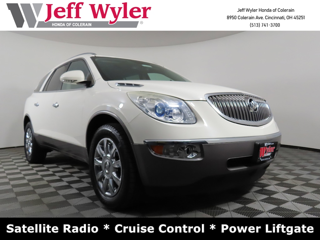 Jeff Wyler Honda of Colerain is proud to offer this great-looking 2011 Buick Enclave CX in White Opal. Well equipped with: Preferred Equipment Group 1CX, 19" x 7.5" Machined Aluminum Wheels, 3.16 Axle Ratio, 3rd row seats: split-bench, 4-Wheel Disc Brakes, 6 Speakers, 7-Passenger Seating w/2nd Row Captain's Chairs, ABS brakes, Air Conditioning, Alloy wheels, AM/FM radio: XM, AM/FM Stereo w/CD Player & MP3 Playback, Auto-dimming Rear-View mirror, Automatic temperature control, Brake assist, CD player, Cloth Seating Surfaces, Compass, Delay-off headlights, Driver door bin, Driver vanity mirror, Dual front impact airbags, Dual front side impact airbags, Electronic Stability Control, Emergency communication system: OnStar Directions & Connections, Four wheel independent suspension, Front anti-roll bar, Front Bucket Seats, Front Center Armrest w/Storage, Front dual zone A/C, Front fog lights, Front License Plate Mounting Bracket, Front reading lights, Fully automatic headlights, Garage door transmitter, Heated door mirrors, High intensity discharge headlights: Bi-Xenon, Illuminated entry, Leather steering wheel, Low tire pressure warning, Occupant sensing airbag, Outside temperature display, Overhead airbag, Panic alarm, Passenger door bin, Passenger vanity mirror, Power door mirrors, Power driver seat, Power Liftgate, Power passenger seat, Power steering, Power windows, Premium Ride Suspension, Radio data system, Rear air conditioning, Rear anti-roll bar, Rear reading lights, Rear window defroster, Rear window wiper, Remote keyless entry, Roof rack: rails only, Security system, Speed control, Speed-sensing steering, Spoiler, Steering wheel mounted audio controls, Tachometer, Telescoping steering wheel, Tilt steering wheel, Traction control, Trip computer, Turn signal indicator mirrors, Variably intermittent wipers, Voltmeter, and XM Radio.