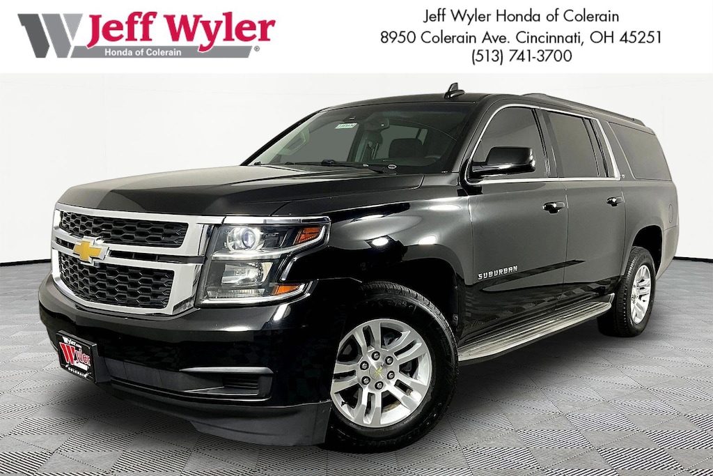 Jeff Wyler Honda of Colerain is pleased to offer this good-looking 2015 Chevrolet Suburban LT in Black. Well equipped with: Preferred Equipment Group 1LT (2nd Row 60/40 Split-Folding Manual Bench, 3rd Row Manual 60/40 Split-Folding Fold Flat Bench, Auto-Dimming Inside Rear-View Mirror, Driver & Front Passenger Airbags, Extended-Range Remote Keyless Entry, Floor Console w/Storage Area, Forward Collision Alert Sensor Indicator, Heavy-Duty Locking Rear Differential (DISC), Lane Departure Warning & Safety Alert Seat, Memory Settings, Power Liftgate, Power-Adjustable Accelerator & Brake Pedals, Rear Park Assist, and Universal Home Remote), Premium Smooth Ride Suspension Package, 18" x 8.5" Aluminum Wheels, 3.08 Rear Axle Ratio, 3rd row seats: split-bench, 4-Wheel Disc Brakes, 9 Speakers, ABS brakes, Adjustable pedals, Air Conditioning, Alloy wheels, AM/FM radio: SiriusXM, Auto-dimming door mirrors, Auto-dimming Rear-View mirror, Automatic temperature control, Bose Premium Audio System Feature, Brake assist, Bumpers: body-color, CD player, Compass, Delay-off headlights, Driver door bin, Driver vanity mirror, Dual front impact airbags, Dual front side impact airbags, Electronic Stability Control, Emergency communication system: OnStar Directions & Connections, Exterior Parking Camera Rear, Front anti-roll bar, Front Bucket Seats, Front Center Armrest, Front dual zone A/C, Front reading lights, Front wheel independent suspension, Fully automatic headlights, Garage door transmitter, Heated door mirrors, Heated Front Reclining Bucket Seats, Heated front seats, Illuminated entry, Leather-Appointed Seat Trim, Low tire pressure warning, Memory seat, Occupant sensing airbag, OnStar w/4G LTE, Outside temperature display, Overhead airbag, Overhead console, Panic alarm, Passenger door bin, Passenger vanity mirror, Pedal memory, Power door mirrors, Power driver seat, Power passenger seat, Power steering, Power windows, Radio: Chevrolet MyLink AM/FM Stereo w/CD Player, Radio: Chevrolet MyLink w/Navigation/AM/FM Stereo, Rain sensing wipers, Rear air conditioning, Rear anti-roll bar, Rear reading lights, Rear seat center armrest, Rear window defroster, Rear window wiper, Remote keyless entry, Roof rack: rails only, Security system, Single-Slot CD/MP3 Player, SiriusXM Satellite & HD Radio, Speed control, Speed-sensing steering, Split folding rear seat, Spoiler, Steering wheel mounted audio controls, Tachometer, Telescoping steering wheel, Tilt steering wheel, Traction control, Trip computer, Variably intermittent wipers, and Voltmeter.