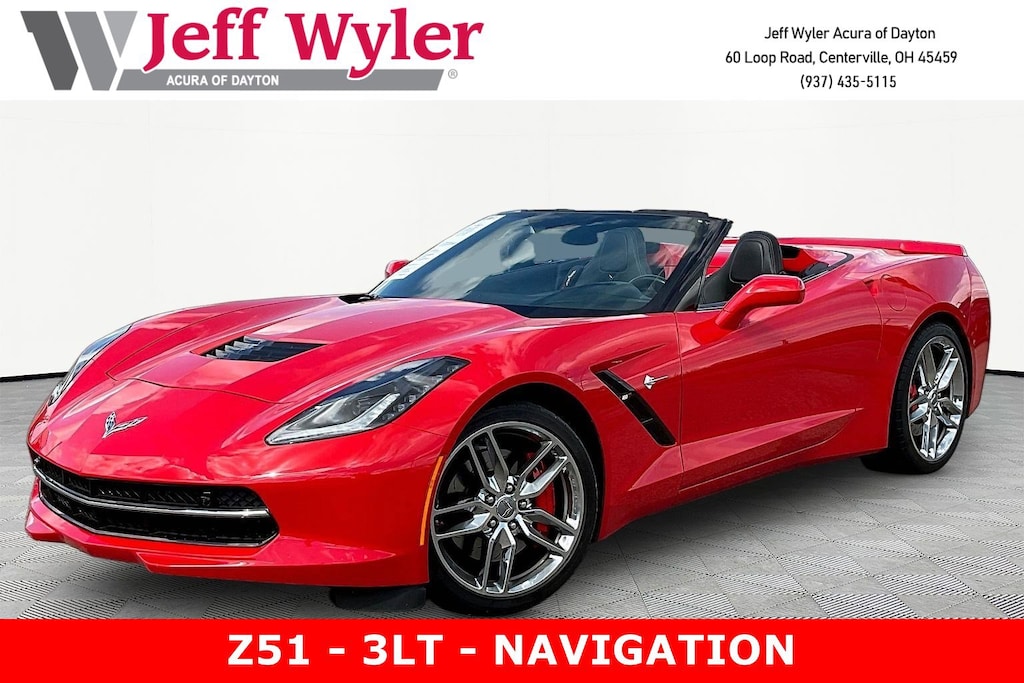 Jeff Wyler Acura of Dayton is delighted to offer this good-looking 2017 Chevrolet Corvette Stingray Z51 in Torch Red. Custom Leather Wrapped Interior Package, Memory Package, Preferred Equipment Group 3LT (3LT Interior Trim, Auto-Dimming Inside Frameless Rearview Mirror, Body-Color Outside Heated Power-Adjustable Mirrors, Bose Advanced 10-Speaker Audio System Feature, Cargo Net, Front Curb View Cameras, Head-Up Display, Heated & Vented Driver & Front Passenger Seats, Performance Data & Video Recorder, Power Lumbar/Bolster Seat Adjusters, Radio: Chevrolet MyLink w/Navigation, Theft Deterrent System, and Universal Home Remote), Sueded Microfiber-Wrapped Interior Trim Package, 2.73 Limited Slip Performance Rear Axle Ratio, 4-Wheel Disc Brakes, 8-Way Driver & Passenger Seat Adjusters, 9 Speakers, ABS brakes, Air Conditioning, Alloy wheels, AM/FM radio: SiriusXM, Apple CarPlay/Android Auto, Automatic temperature control, Bose Premium 9-Speaker Audio System Feature, Bumpers: body-color, Compass, Convertible roof lining, Delay-off headlights, Driver door bin, Driver vanity mirror, Dual front impact airbags, Dual front side impact airbags, Electronic Stability Control, Emergency communication system, Exterior Parking Camera Rear, Four wheel independent suspension, Front anti-roll bar, Front Bucket Seats, Front Center Armrest, Front dual zone A/C, Front reading lights, Fully automatic headlights, Glass rear window, GT Bucket Seats, Heated door mirrors, High-Intensity Discharge Headlights, Illuminated entry, Leather Shift Knob, Leather steering wheel, Low tire pressure warning, Occupant sensing airbag, Outside temperature display, Panic alarm, Passenger door bin, Passenger vanity mirror, Power convertible roof, Power door mirrors, Power driver seat, Power passenger seat, Power steering, Power windows, Premium audio system: Chevrolet MyLink, Radio data system, Rear anti-roll bar, Rear window defroster, Red Painted Calipers, Remote keyless entry, Remote Vehicle Starter System, Speed control, Speed-sensing steering, Spoiler, Sport steering wheel, Steering wheel mounted audio controls, Tachometer, Telescoping steering wheel, Tilt steering wheel, Traction control, Trip computer, Variably intermittent wipers, Voltmeter, Wheels: 19" x 8.5" Fr & 20" x 10" Rr 5-Split Spoke, and Wheels: 19" x 8.5" Fr & 20" x 10" Rr Chrome Alum. Our PRE-OWNED vehicles are put through a rigorous 167- POINT QUALITY ASSURANCE INSPECTION along with an average amount of over $1,400.00 SPENT to recondition each vehicle so we can be sure to deliver you the highest quality vehicle like you deserve! ***ONLINE PRICE DOES NOT INCLUDE WYLER FAMILY FIRST PACKAGE***
