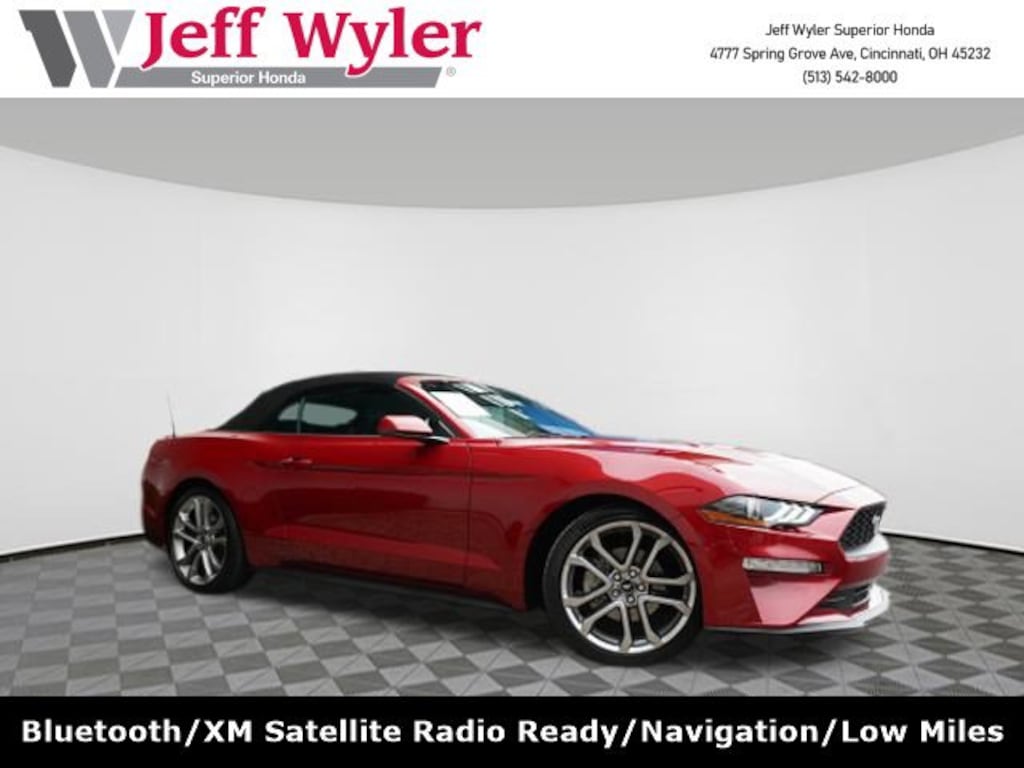 Jeff Wyler Superior Honda is very proud to offer this handsome 2023 Ford Mustang EcoBoost Premium in Red Metallic. 4-Wheel Disc Brakes, 4G LTE Wi-Fi Hotspot Removal, ABS brakes, Active Valve Performance Exhaust, Air Conditioning, Alloy wheels, AM/FM Stereo, Auto High-beam Headlights, Auto-dimming Rear-View mirror, Brake assist, Bumpers: body-color, Compass, Convertible roof lining, Delay-off headlights, Driver door bin, Driver vanity mirror, Dual front impact airbags, Dual front side impact airbags, Electronic Stability Control, Emergency communication system: 911 Assist, Exterior Parking Cameras, Four wheel independent suspension, Front anti-roll bar, Front Bucket Seats, Front Center Armrest, Front reading lights, Fully automatic headlights, Glass rear window, Illuminated entry, Knee airbag, Leather Shift Knob, Low tire pressure warning, Occupant sensing airbag, Outside temperature display, Overhead console, Panic alarm, Passenger door bin, Passenger vanity mirror, Power convertible roof, Power door mirrors, Power steering, Power windows, Radio data system, Rain sensing wipers, Rear anti-roll bar, Rear Parking Sensors, Rear window defroster, Remote keyless entry, Security system, SiriusXM Radio, Speed control, Speed-sensing steering, Speed-Sensitive Wipers, Steering wheel mounted audio controls, SYNC 3 Communications & Entertainment System, Tachometer, Telescoping steering wheel, Tilt steering wheel, Traction control, Trip computer, Variably intermittent wipers, Voltmeter, and Wheels: 18" x 8" Machined-Face Aluminum Our PRE-OWNED vehicles are put through a rigorous 167- POINT QUALITY ASSURANCE INSPECTION along with an average amount of over $1,400.00 SPENT to recondition each vehicle so we can be sure to deliver you the highest quality vehicle like you deserve! ***ONLINE PRICE DOES NOT INCLUDE WYLER FAMILY FIRST PACKAGE*** Stop by 4777 Spring Grove Ave. Road to see for yourself, or give us a call @ 283-209-1858 to schedule your test drive!Vehicle pricing includes all offers and incentives. Due to limited inventory, offers and pricing are all subject to change. Tax, Title, Tags and $387 doc fees are not included in vehicle price shown and must be paid by the purchaser. Doc fees vary by location. Financing w/approved credit. Mileage est. Based on current EPA estimates reflecting new EPA methods beginning w/ 2008 models. For comparison only. Do not compare to pre 2008 models. Actual mileage may vary based on how you drive and maintain your vehicle. Information on this site includes 3rd party data believed to be reliable, subject to change without notice. Jeff Wyler reserves the right to correct any errors and/or omissions in the compilation or presentation of this data and makes no representations express or implied to any prospective purchaser as to the vehicle's condition, specifications, history, equipment or equipment function, price or warranties. This vehicle may be subject to an open recall that has not been repaired. Please consult safercar.gov for more information on the current status. It is the responsibility of purchaser to confirm any data prior to purchase. Other than MSRP, all offers only apply to this vehicle and are subject to change. Vehicle prices are subject to change and all vehicles are subject to prior sale and may not be available when you are ready to purchase. Prices listed on any other website may not be accepted. Dealership advertises the sale of vehicles through a number of different channels and cannot always control when they are updated. Wyler? and Jeff Wyler? are registered trademarks of the Jeff Wyler Automotive Family, Inc.