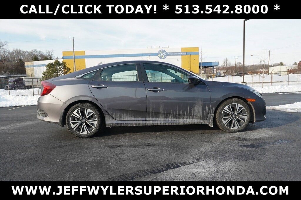 Jeff Wyler Superior Honda is excited to offer this beautiful-looking 2016 Honda Civic EX-L in Modern Steel Metallic. BLUETOOTH, LEATHER, and MOONROOF SUNROOF Civic EX-L, 4D Sedan, 1.5L I-4 DI DOHC Turbocharged, CVT, FWD, Modern Steel Metallic, Black Leather, 17" Alloy Wheels, 4-Wheel Disc Brakes, 8 Speakers, ABS brakes, Air Conditioning, Alloy wheels, AM/FM radio: SiriusXM, Apple CarPlay/Android Auto, Auto-dimming Rear-View mirror, Automatic temperature control, Brake assist, Bumpers: body-color, Compass, Delay-off headlights, Driver door bin, Driver vanity mirror, Dual front impact airbags, Dual front side impact airbags, Electronic Stability Control, Emergency communication system: HondaLink Assist, Exterior Parking Cameras, Four wheel independent suspension, Front anti-roll bar, Front Bucket Seats, Front Center Armrest, Front dual zone A/C, Front fog lights, Front reading lights, Fully automatic headlights, Heated door mirrors, Heated front seats, Illuminated entry, Leather Seat Trim, Leather Shift Knob, Low tire pressure warning, Occupant sensing airbag, Outside temperature display, Overhead airbag, Panic alarm, Passenger door bin, Passenger vanity mirror, Power door mirrors, Power driver seat, Power moonroof, Power steering, Power windows, Radio data system, Radio: 180-Watt AM/FM/HD/SiriusXM Audio System, Rear anti-roll bar, Rear seat center armrest, Rear window defroster, Reclining Heated Front Bucket Seats, Remote keyless entry, Security system, Speed control, Speed-sensing steering, Speed-Sensitive Wipers, Split folding rear seat, Spoiler, Steering wheel mounted audio controls, Tachometer, Telescoping steering wheel, Tilt steering wheel, Traction control, Trip computer, and Variably intermittent wipers Our PRE-OWNED vehicles are put through a rigorous 167- POINT QUALITY ASSURANCE INSPECTION along with an average amount of over $1,400.00 SPENT to recondition each vehicle so we can be sure to deliver you the highest quality vehicle like you deserve! ***ONLINE PRICE DOES NOT INCLUDE WYLER FAMILY FIRST PACKAGE*** Stop by 4777 Spring Grove Ave. Road to see for yourself, or give us a call @ 283-209-1858 to schedule your test drive!Vehicle pricing includes all offers and incentives. Due to limited inventory, offers and pricing are all subject to change. Tax, Title, Tags and $387 doc fees are not included in vehicle price shown and must be paid by the purchaser. Doc fees vary by location. Financing w/approved credit. Mileage est. Based on current EPA estimates reflecting new EPA methods beginning w/ 2008 models. For comparison only. Do not compare to pre 2008 models. Actual mileage may vary based on how you drive and maintain your vehicle. Information on this site includes 3rd party data believed to be reliable, subject to change without notice. Jeff Wyler reserves the right to correct any errors and/or omissions in the compilation or presentation of this data and makes no representations express or implied to any prospective purchaser as to the vehicle's condition, specifications, history, equipment or equipment function, price or warranties. This vehicle may be subject to an open recall that has not been repaired. Please consult safercar.gov for more information on the current status. It is the responsibility of purchaser to confirm any data prior to purchase. Other than MSRP, all offers only apply to this vehicle and are subject to change. Vehicle prices are subject to change and all vehicles are subject to prior sale and may not be available when you are ready to purchase. Prices listed on any other website may not be accepted. Dealership advertises the sale of vehicles through a number of different channels and cannot always control when they are updated. Wyler? and Jeff Wyler? are registered trademarks of the Jeff Wyler Automotive Family, Inc.