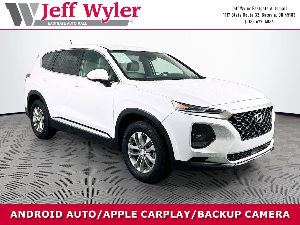 Jeff Wyler Eastgate Auto Mall is pleased to offer this superb-looking 2020 Hyundai Santa Fe SE in Quartz White. Well equipped with: Option Group 01, 17" x 7.0J Alloy Wheels, 4-Wheel Disc Brakes, 6 Speakers, ABS brakes, Air Conditioning, Alloy wheels, AM/FM radio, Apple CarPlay & Android Auto, Auto High-beam Headlights, Axle Ratio 3.798, Brake assist, Bumpers: body-color, Cargo Cover, Cargo Net, Cargo Tray, Carpeted Floor Mats, Delay-off headlights, Driver door bin, Driver vanity mirror, Dual front impact airbags, Dual front side impact airbags, Electronic Stability Control, Exterior Parking Camera Rear, First Aid Kit, Four wheel independent suspension, Front anti-roll bar, Front Bucket Seats, Front Center Armrest, Front reading lights, Fully automatic headlights, Illuminated entry, Low tire pressure warning, Occupant sensing airbag, Outside temperature display, Overhead airbag, Overhead console, Panic alarm, Passenger door bin, Passenger vanity mirror, Power door mirrors, Power steering, Power windows, Radio: AM/FM/MP3 Display Audio, Rear anti-roll bar, Rear seat center armrest, Rear window defroster, Rear window wiper, Remote keyless entry, Security system, Speed control, Speed-sensing steering, Split folding rear seat, Spoiler, Stain-Resistant Cloth Seating Surfaces, Steering wheel mounted audio controls, Tachometer, Telescoping steering wheel, Tilt steering wheel, Traction control, Trip computer, and Variably intermittent wipers. CARFAX One-Owner. Ask about available certifications. Used vehicles 10 years of age or newer with less than 100,000 miles are eligible for the Wyler Assurance Program, but eligible vehicles must pass our reconditioning process and multi-point inspection. Provided the vehicle passes inspection, vehicles will be eligible for the 6 month/6,000 mile limited warranty. The 6 month/6,000 mile limited warranty is NOT available on AS-IS vehicles, wholesale vehicles, lease buyback/pass-thru vehicles or un-inspected vehicles. Note that this program can also apply to vehicles where the remaining factory coverage is less than 6 months or 6,000 miles. Please check the Federal Trade Commission (FTC) Buyers guide on the vehicle for full details as to whether or not warranty coverage may apply. Contact Dealer for additional details. The Wyler Assurance 6 month/6,000 Mile limited warranty ends 6 months from the date of the Retail Purchase Agreement (BUYERS ORDER) or when the vehicle's odometer registers 6,000 additional miles to the mileage listed on the BUYERS ORDER, whichever comes first. Your Deductible - The warranty holder on your contract pays the first $100 of each covered repair.