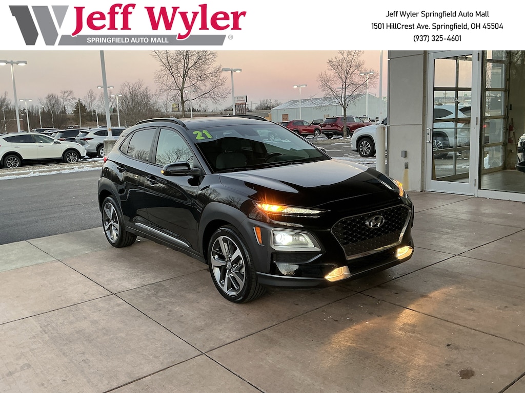 Jeff Wyler Springfield Auto Mall is very proud to offer this handsome 2021 Hyundai Kona Limited in Ultra Black Pearl. Well equipped with: Option Group 01, 3.579 Axle Ratio, 4-Wheel Disc Brakes, 8 Speakers, ABS brakes, Air Conditioning, Alloy wheels, AM/FM radio: SiriusXM, Apple CarPlay & Android Auto, Auto-dimming Rear-View mirror, Automatic temperature control, Brake assist, Bumpers: body-color, Delay-off headlights, Driver door bin, Driver vanity mirror, Dual front impact airbags, Dual front side impact airbags, Electronic Stability Control, Emergency communication system, Exterior Parking Camera Rear, Four wheel independent suspension, Front anti-roll bar, Front Bucket Seats, Front Center Armrest, Front fog lights, Front reading lights, Fully automatic headlights, Garage door transmitter: HomeLink, Heated door mirrors, Heated Front Bucket Seats, Heated front seats, Illuminated entry, Leather Seat Trim, Leather Shift Knob, Leather steering wheel, Low tire pressure warning, Occupant sensing airbag, Outside temperature display, Overhead airbag, Overhead console, Panic alarm, Passenger door bin, Passenger vanity mirror, Power door mirrors, Power driver seat, Power moonroof, Power steering, Power windows, Radio: AM/FM/MP3/HD Radio/SiriusXM Audio System, Rear anti-roll bar, Rear seat center armrest, Rear window defroster, Rear window wiper, Remote keyless entry, Roof rack: rails only, Security system, Speed control, Speed-sensing steering, Split folding rear seat, Spoiler, Steering wheel mounted audio controls, Tachometer, Telescoping steering wheel, Tilt steering wheel, Traction control, Trip computer, Turn signal indicator mirrors, Variably intermittent wipers, and Wheels: 18 x 7.5J Alloy. Ask about available certifications. Used vehicles 10 years of age or newer with less than 100,000 miles are eligible for the Wyler Assurance Program, but eligible vehicles must pass our reconditioning process and multi-point inspection. Provided the vehicle passes inspection, vehicles will be eligible for the 6 month/6,000 mile limited warranty. The 6 month/6,000 mile limited warranty is NOT available on AS-IS vehicles, wholesale vehicles, lease buyback/pass-thru vehicles or un-inspected vehicles. Note that this program can also apply to vehicles where the remaining factory coverage is less than 6 months or 6,000 miles. Please check the Federal Trade Commission (FTC) Buyers guide on the vehicle for full details as to whether or not warranty coverage may apply. Contact Dealer for additional details. The Wyler Assurance 6 month/6,000 Mile limited warranty ends 6 months from the date of the Retail Purchase Agreement (BUYERS ORDER) or when the vehicle's odometer registers 6,000 additional miles to the mileage listed on the BUYERS ORDER, whichever comes first. Your Deductible - The warranty holder on your contract pays the first $100 of each covered repair.