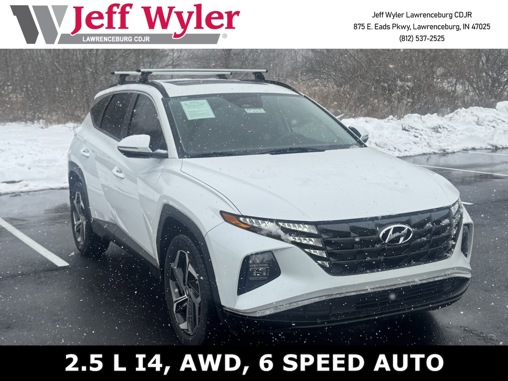 Jeff Wyler Chrysler Dodge Jeep of Lawrenceburg is honored to offer this wonderful 2022 Hyundai Tucson SEL in Quartz White. Convenience Package (10.25" Digital Instrument Cluster, Auto-Dimming Interior Mirror w/Homelink, Digital Key, Dual Automatic Temperature Control, Hands-Free Power Liftgate w/Auto-Open, Leather-Wrapped Shift Knob, Leather-Wrapped Steering Wheel, LED Interior Lights (Room, Map), Option Group 02, Power Sunroof, Ultrasonic Rear Occupant Alert, Wheels: 19" x 7.5J" Machine-Face Finish Alloy, and Wireless Phone Charging), AWD, 3.648 Axle Ratio, 4-Wheel Disc Brakes, 6 Speakers, ABS brakes, Air Conditioning, Alloy wheels, AM/FM radio: SiriusXM, Apple CarPlay & Android Auto, Auto High-beam Headlights, Brake assist, Bumpers: body-color, Cargo Cover, Cargo Net, Cargo Tray, Carpeted Floor Mats, Delay-off headlights, Driver door bin, Driver vanity mirror, Dual front impact airbags, Dual front side impact airbags, Electronic Stability Control, Emergency communication system: Blue Link Connected Car Service (3-year complimentary subscription), Four wheel independent suspension, Front and Rear Mudguards, Front anti-roll bar, Front Bucket Seats, Front Center Armrest, Front reading lights, Fully automatic headlights, Heated door mirrors, Heated Front Bucket Seats, Heated front seats, Illuminated entry, Low tire pressure warning, Occupant sensing airbag, Outside temperature display, Overhead airbag, Overhead console, Panic alarm, Passenger door bin, Passenger vanity mirror, Power door mirrors, Power driver seat, Power steering, Power windows, Radio data system, Radio: AM/FM/HD/SiriusXM Audio System, Rear anti-roll bar, Rear seat center armrest, Rear window defroster, Rear window wiper, Remote keyless entry, Roof Rack Cross Rails, Roof rack: rails only, Security system, Speed control, Split folding rear seat, Spoiler, Stain & Odor Resistant Cloth Seat Trim, Steering wheel mounted audio controls, Tachometer, Telescoping steering wheel, Tilt steering wheel, Traction control, Trip computer, Turn signal indicator mirrors, Variably intermittent wipers, Wheel Locks, and Wheels: 17" x 7.0J" Alloy Our PRE-OWNED vehicles are put through a rigorous 167- POINT QUALITY ASSURANCE INSPECTION along with an average amount of over $1,400.00 SPENT to recondition each vehicle so we can be sure to deliver you the highest quality vehicle like you deserve! ***ONLINE PRICE DOES NOT INCLUDE WYLER FAMILY FIRST PACKAGE*** Stop by 4136 Shelbyville Road to see for yourself, or give us a call @ 502-897-3151 to schedule your test drive! Ask about available certifications.