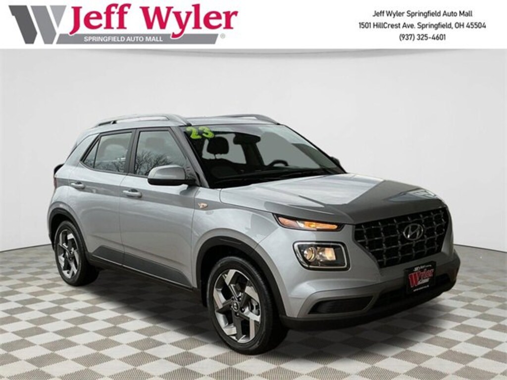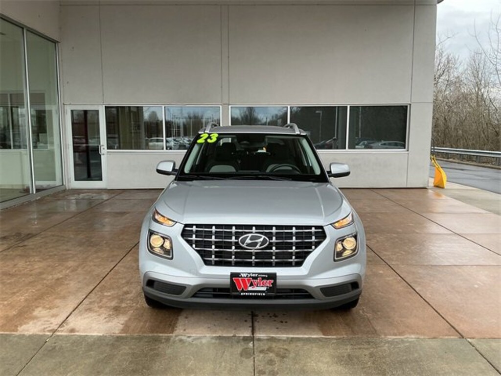 Jeff Wyler Springfield Auto Mall is pumped up to offer this wonderful-looking 2023 Hyundai Venue SEL in Stellar Silver. Well equipped with: Option Group 01, 4-Wheel Disc Brakes, 6 Speakers, 6.052 Axle Ratio, 6.5J x 17 Alloy Wheels, ABS brakes, Air Conditioning, Alloy wheels, AM/FM radio, Apple CarPlay & Android Auto, Auto High-beam Headlights, Automatic temperature control, Brake assist, Bumpers: body-color, Cargo Net, Cargo Tray, Carpeted Floor Mats, Cloth Seat Trim, Delay-off headlights, Driver door bin, Driver vanity mirror, Dual front impact airbags, Dual front side impact airbags, Electronic Stability Control, Front anti-roll bar, Front Bucket Seats, Front Center Armrest, Front reading lights, Front wheel independent suspension, Fully automatic headlights, Illuminated entry, Leather Shift Knob, Leather steering wheel, Low tire pressure warning, Mudguards, Occupant sensing airbag, Outside temperature display, Overhead airbag, Overhead console, Panic alarm, Passenger door bin, Passenger vanity mirror, Power door mirrors, Power moonroof, Power steering, Power windows, Radio: AM/FM/HD Display Audio, Rear Seat Cup Holder, Rear window defroster, Rear window wiper, Remote keyless entry, Roof rack: rails only, Security system, Speed control, Speed-sensing steering, Split folding rear seat, Spoiler, Steering wheel mounted audio controls, Tachometer, Telescoping steering wheel, Tilt steering wheel, Traction control, Trip computer, and Variably intermittent wipers. Ask about available certifications. Used vehicles 10 years of age or newer with less than 100,000 miles are eligible for the Wyler Assurance Program, but eligible vehicles must pass our reconditioning process and multi-point inspection. Provided the vehicle passes inspection, vehicles will be eligible for the 6 month/6,000 mile limited warranty. The 6 month/6,000 mile limited warranty is NOT available on AS-IS vehicles, wholesale vehicles, lease buyback/pass-thru vehicles or un-inspected vehicles. Note that this program can also apply to vehicles where the remaining factory coverage is less than 6 months or 6,000 miles. Please check the Federal Trade Commission (FTC) Buyers guide on the vehicle for full details as to whether or not warranty coverage may apply. Contact Dealer for additional details. The Wyler Assurance 6 month/6,000 Mile limited warranty ends 6 months from the date of the Retail Purchase Agreement (BUYERS ORDER) or when the vehicle's odometer registers 6,000 additional miles to the mileage listed on the BUYERS ORDER, whichever comes first. Your Deductible - The warranty holder on your contract pays the first $100 of each covered repair.