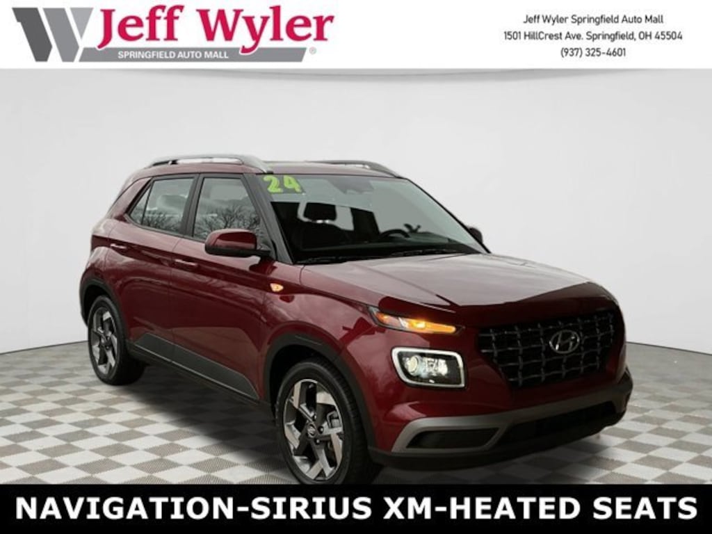 Jeff Wyler Springfield Auto Mall is excited to offer this charming 2024 Hyundai Venue Limited in Ultimate Red. Well equipped with: Option Group 01, 4-Wheel Disc Brakes, 6 Speakers, 6.483 Axle Ratio, 6.5J x 17 Alloy Wheels, ABS brakes, Air Conditioning, Alloy wheels, AM/FM radio: SiriusXM, Apple CarPlay & Android Auto, Auto High-beam Headlights, Automatic temperature control, Brake assist, Bumpers: body-color, Carpeted Floor Mats, Cloth & Leatherette Seat Trim, Crossbar Kit, Delay-off headlights, Driver door bin, Driver vanity mirror, Dual front impact airbags, Dual front side impact airbags, Electronic Stability Control, Emergency communication system, First Aid Kit, Front anti-roll bar, Front Bucket Seats, Front Center Armrest, Front reading lights, Front wheel independent suspension, Fully automatic headlights, Heated door mirrors, Heated Front Bucket Seats, Heated front seats, Illuminated entry, Leather Shift Knob, Leather steering wheel, Low tire pressure warning, Navigation System, Occupant sensing airbag, Outside temperature display, Overhead airbag, Overhead console, Panic alarm, Passenger door bin, Passenger vanity mirror, Power door mirrors, Power steering, Power windows, Radio: AM/FM/HD/SiriusXM w/Navigation System, Rear Seat Cup Holder, Rear window defroster, Rear window wiper, Remote keyless entry, Roof rack: rails only, Security system, Speed control, Speed-sensing steering, Split folding rear seat, Spoiler, Steering wheel mounted audio controls, Tachometer, Telescoping steering wheel, Tilt steering wheel, Traction control, Trip computer, and Variably intermittent wipers. Ask about available certifications. Used vehicles 10 years of age or newer with less than 100,000 miles are eligible for the Wyler Assurance Program, but eligible vehicles must pass our reconditioning process and multi-point inspection. Provided the vehicle passes inspection, vehicles will be eligible for the 6 month/6,000 mile limited warranty. The 6 month/6,000 mile limited warranty is NOT available on AS-IS vehicles, wholesale vehicles, lease buyback/pass-thru vehicles or un-inspected vehicles. Note that this program can also apply to vehicles where the remaining factory coverage is less than 6 months or 6,000 miles. Please check the Federal Trade Commission (FTC) Buyers guide on the vehicle for full details as to whether or not warranty coverage may apply. Contact Dealer for additional details. The Wyler Assurance 6 month/6,000 Mile limited warranty ends 6 months from the date of the Retail Purchase Agreement (BUYERS ORDER) or when the vehicle's odometer registers 6,000 additional miles to the mileage listed on the BUYERS ORDER, whichever comes first. Your Deductible - The warranty holder on your contract pays the first $100 of each covered repair.