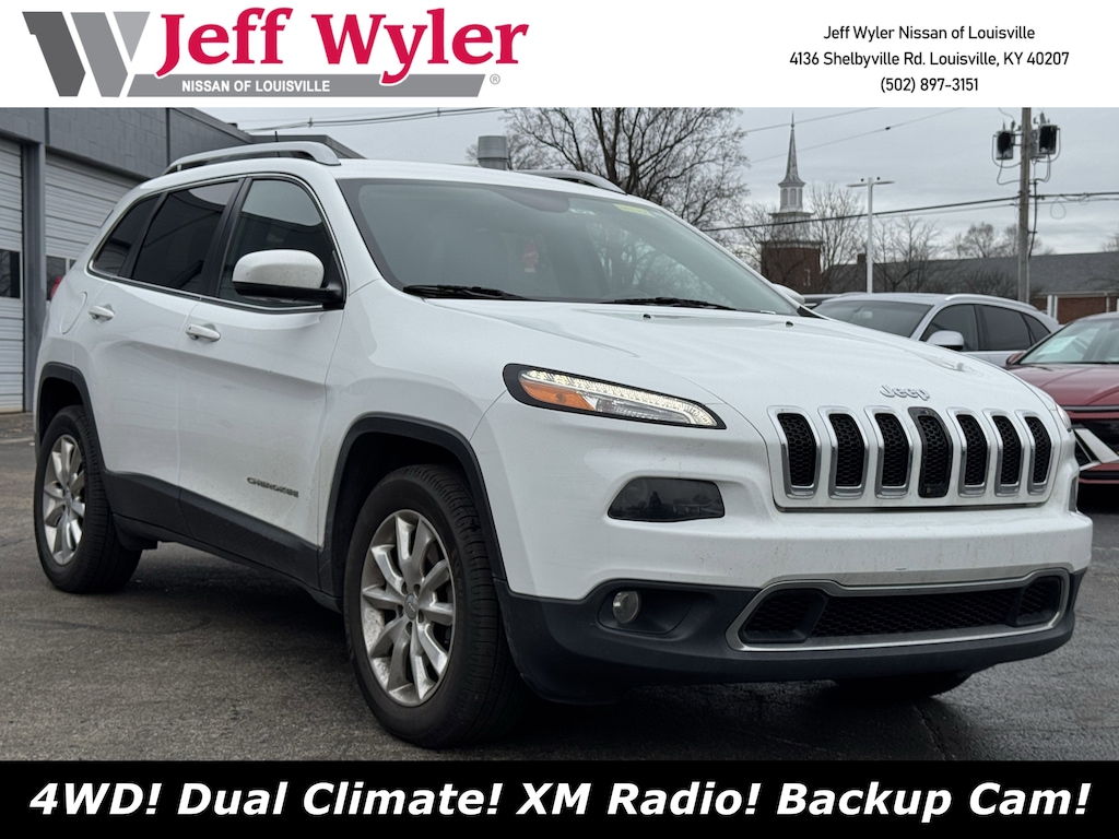 Jeff Wyler Nissan of Louisville is very proud to offer this good-looking 2017 Jeep Cherokee Limited in Bright White Clearcoat. ** HOME DELIVERY OPTIONS! ** Quick Order Package 24G, 3.73 Axle Ratio, 4-Wheel Disc Brakes, 6 Speakers, 600 Amp Maintenance Free Battery, 8.4" Touchscreen Display, ABS brakes, Active Grille Shutters, Air Conditioning, Alloy wheels, AM/FM radio: SiriusXM, Anti-whiplash front head restraints, Auto-dimming Rear-View mirror, Automatic temperature control, Auxiliary Transmission Oil Cooler, Brake assist, Bumpers: body-color, Compass, Delay-off headlights, Driver door bin, Driver vanity mirror, Dual front impact airbags, Dual front side impact airbags, Electronic Stability Control, Emergency communication system: Uconnect Access, Engine Oil Cooler, Exterior Mirrors Courtesy Lamps, Exterior Mirrors w/Supplemental Signals, Four wheel independent suspension, Front anti-roll bar, Front Bucket Seats, Front Center Armrest, Front dual zone A/C, Front fog lights, Front reading lights, Fully automatic headlights, Garage door transmitter, Heated door mirrors, Heated front seats, Heated steering wheel, High intensity discharge headlights: Bi-Xenon, Illuminated entry, Integrated Voice Command w/Bluetooth, Knee airbag, Leather Shift Knob, Leather Trimmed Bucket Seats, Low tire pressure warning, Normal Duty Suspension, Occupant sensing airbag, Outside temperature display, Overhead airbag, Overhead console, Panic alarm, ParkView Rear Back-Up Camera, Passenger door bin, Passenger vanity mirror, Power door mirrors, Power driver seat, Power steering, Power windows, Radio data system, Radio: Uconnect 3C w/8.4" Display, Rear anti-roll bar, Rear reading lights, Rear seat center armrest, Rear side impact airbag, Rear window defroster, Rear window wiper, Remote keyless entry, Roof rack: rails only, Security system, SIRIUSXM Satellite Radio, Speed control, Speed-sensing steering, Split folding rear seat, Spoiler, Steering wheel mounted audio controls, Tachometer, Telescoping steering wheel, Tilt steering wheel, Traction control, Trip computer, Turn signal indicator mirrors, Uconnect Access, Variably intermittent wipers, Voltmeter, Wheels: 18" x 7" Painted Aluminum, and Wheels: 18" x 7" Polished Aluminum (DISC) Our PRE-OWNED vehicles are put through a rigorous 167- POINT QUALITY ASSURANCE INSPECTION along with an average amount of over $1,400.00 SPENT to recondition each vehicle so we can be sure to deliver you the highest quality vehicle like you deserve! ***ONLINE PRICE DOES NOT INCLUDE WYLER FAMILY FIRST PACKAGE*** Stop by 4136 Shelbyville Road to see for yourself, or give us a call @ 502-897-3151 to schedule your test drive!