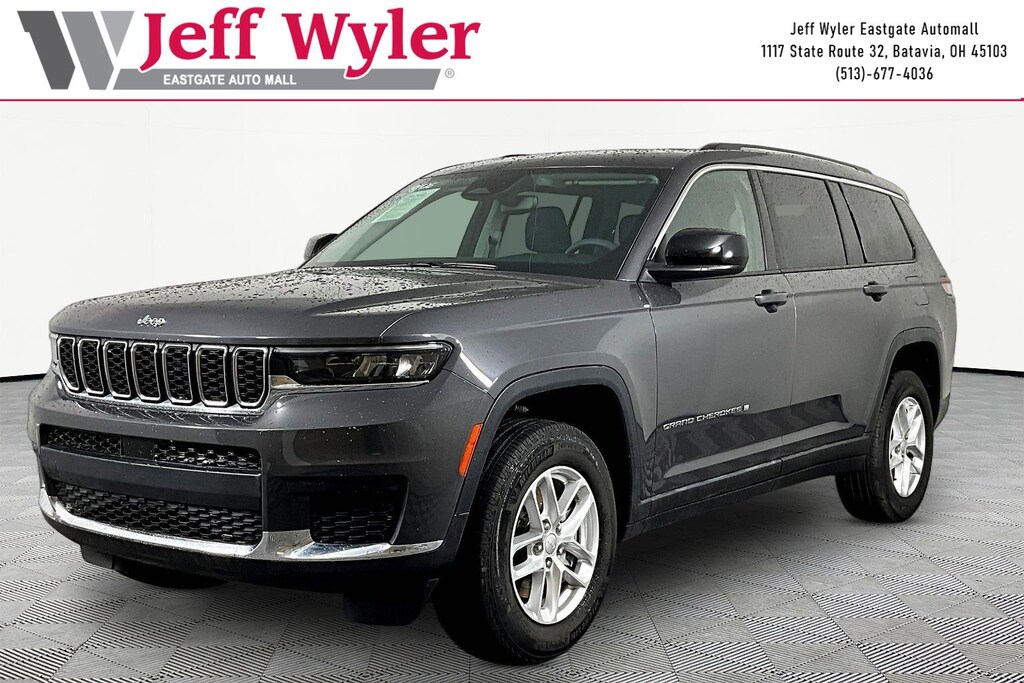 Jeff Wyler Eastgate Auto Mall is delighted to offer this good-looking 2023 Jeep Grand Cherokee L Laredo in Baltic Gray Metallic Clearcoat. Well equipped with: Quick Order Package 23A Laredo, 3.45 Rear Axle Ratio, 3rd row seats: split-bench, 4-Wheel Disc Brakes, 6 Speakers, ABS brakes, Air Conditioning, Alloy wheels, Anti-whiplash front head restraints, Automatic temperature control, Brake assist, Bumpers: body-color, Cloth Seats, Compass, Delay-off headlights, Driver door bin, Driver vanity mirror, Dual front impact airbags, Dual front side impact airbags, Electronic Stability Control, Emergency communication system, Four wheel independent suspension, Front anti-roll bar, Front Bucket Seats, Front Center Armrest w/Storage, Front dual zone A/C, Front License Plate Bracket, Front reading lights, Fully automatic headlights, Heated door mirrors, Illuminated entry, Knee airbag, Low tire pressure warning, Manual Fold Seatbacks, Molded In Color Black/Gloss Black Roof Rails, Normal Duty Suspension, Occupant sensing airbag, Outside temperature display, Overhead airbag, Overhead console, Panic alarm, ParkView Rear Back-Up Camera, Passenger door bin, Passenger vanity mirror, Power door mirrors, Power driver seat, Power steering, Power windows, Radio data system, Radio: Uconnect 5 w/8.4" Display, Rear air conditioning, Rear anti-roll bar, Rear reading lights, Rear window defroster, Rear window wiper, Reclining 3rd row seat, Remote keyless entry, Security system, Speed control, Speed-Sensitive Wipers, Split folding rear seat, Spoiler, Steering wheel mounted audio controls, Tachometer, Telescoping steering wheel, Tilt steering wheel, Traction control, Trip computer, Variably intermittent wipers, Voltmeter, and Wheels: 18" x 8.0" Fully Painted Aluminum. Ask about available certifications. Used vehicles 10 years of age or newer with less than 100,000 miles are eligible for the Wyler Assurance Program, but eligible vehicles must pass our reconditioning process and multi-point inspection. Provided the vehicle passes inspection, vehicles will be eligible for the 6 month/6,000 mile limited warranty. The 6 month/6,000 mile limited warranty is NOT available on AS-IS vehicles, wholesale vehicles, lease buyback/pass-thru vehicles or un-inspected vehicles. Note that this program can also apply to vehicles where the remaining factory coverage is less than 6 months or 6,000 miles. Please check the Federal Trade Commission (FTC) Buyers guide on the vehicle for full details as to whether or not warranty coverage may apply. Contact Dealer for additional details. The Wyler Assurance 6 month/6,000 Mile limited warranty ends 6 months from the date of the Retail Purchase Agreement (BUYERS ORDER) or when the vehicle's odometer registers 6,000 additional miles to the mileage listed on the BUYERS ORDER, whichever comes first. Your Deductible - The warranty holder on your contract pays the first $100 of each covered repair.