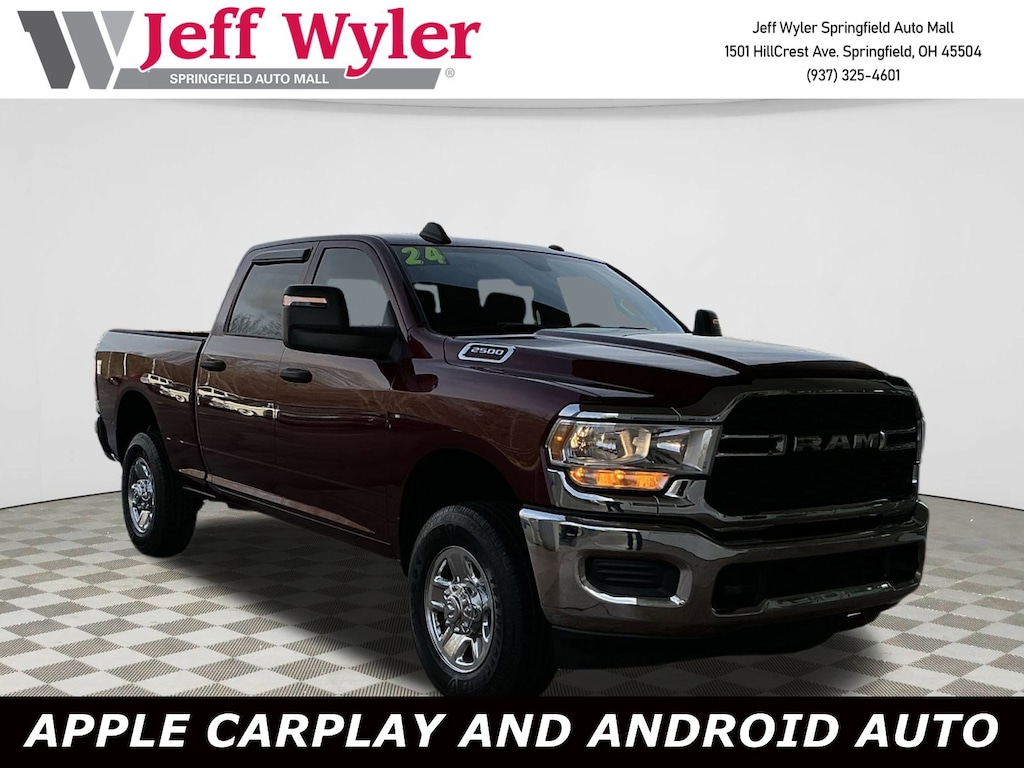 Jeff Wyler Springfield Auto Mall is pumped up to offer this good-looking 2024 Ram 2500 Tradesman in Delmonico Red Pearlcoat. Well equipped with: Chrome Appearance Group (Bright Front Bumper, Bright Rear Bumper, Center Hub, Chrome Grille Surround, Chrome Headlamp Bezels, Matte Black Mesh Grille w/Chrome, and Wheels: 18" x 8.0" Steel Chrome Clad), Protection Group (Tow Hooks), Quick Order Package 2GA Tradesman, Tradesman Level 2 Equipment Group (2 Way Rear Headrest Seat, 4 Way Front Headrests, 40/20/40 Split Bench Seat, Black Exterior Mirrors, Cloth 40/20/40 Bench Seat, Exterior Mirrors Courtesy Lamps, Exterior Mirrors w/Heating Element, Exterior Mirrors w/Supplemental Signals, For More Info, Call 800-643-2112, Front Armrest w/Cupholders, Manual Adjust 4-Way Driver Seat, Manual Adjust 4-Way Front Passenger Seat, Manual Folding Exterior Mirrors, Manual Telescoping Mirrors, Mirror Running Lights, Power Adjust Mirrors, Power Adjustable Convex Aux Mirrors, Power Heated Folding Telescope Mirrors, Rear Folding Seat, Rear Power Sliding Window, Rear Window Defroster, Remote USB Port - Charge Only, SiriusXM Radio Service, SiriusXM Satellite Radio, and Storage Tray), 17" x 7.5" Steel Styled Wheels, 3.73 Axle Ratio, 4-Wheel Disc Brakes, 4G LTE Wi-Fi Hot Spot, 6 Speakers, 8.4" Touchscreen Display, ABS brakes, Active Noise Control System, Air Conditioning, All R1 Low Radios, All Radio Equipped Vehicles, AM/FM radio, Anti-Spin Differential Rear Axle, Apple CarPlay, Bluetooth Handsfree Phone & Audio, Brake assist, Carpet Floor Covering, Compass, Connectivity - US/Canada, Delay-off headlights, Driver door bin, Dual front impact airbags, Dual front side impact airbags, Electric Shift-On-The-Fly Transfer Case, Electronic Stability Control, Electronically Controlled Throttle, Emergency communication system: SiriusXM Guardian, For Details, Visit DriveUconnect.com, Front & Rear Floor Mats, Front anti-roll bar, Front Center Armrest w/Storage, Front reading lights, Fully automatic headlights, Global Telematics Box Module (TBM), Google Android Auto, GPS Antenna Input, Heavy Duty Vinyl 40/20/40 Split Bench Seat, Illuminated entry, Integrated Center Stack Radio, Integrated Voice Command w/Bluetooth, Low tire pressure warning, MOPAR Front & Rear Rubber Floor Mats, Occupant sensing airbag, Outside temperature display, Overhead airbag, Overhead console, ParkView Rear Back-Up Camera, Passenger door bin, Passenger vanity mirror, Power steering, Power windows, Radio data system, Radio: Uconnect 3 w/5" Display, Radio: Uconnect 5 W w/8.4" Display, Rear anti-roll bar, Rear step bumper, Selectable Tire Fill Alert, Speed control, Tachometer, Tilt steering wheel, Tip Start, Traction control, Trailer Brake Control, Trailer Light Check, Variably intermittent wipers, and VoltmeteR. Ask about available certifications. Used vehicles 10 years of age or newer with less than 100,000 miles are eligible for the Wyler Assurance Program, but eligible vehicles must pass our reconditioning process and multi-point inspection. Provided the vehicle passes inspection, vehicles will be eligible for the 6 month/6,000 mile limited warranty. The 6 month/6,000 mile limited warranty is NOT available on AS-IS vehicles, wholesale vehicles, lease buyback/pass-thru vehicles or un-inspected vehicles. Note that this program can also apply to vehicles where the remaining factory coverage is less than 6 months or 6,000 miles. Please check the Federal Trade Commission (FTC) Buyers guide on the vehicle for full details as to whether or not warranty coverage may apply. Contact Dealer for additional details. The Wyler Assurance 6 month/6,000 Mile limited warranty ends 6 months from the date of the Retail Purchase Agreement (BUYERS ORDER) or when the vehicle's odometer registers 6,000 additional miles to the mileage listed on the BUYERS ORDER, whichever comes first. Your Deductible - The warranty holder on your contract pays the first $100 of each covered repair.
