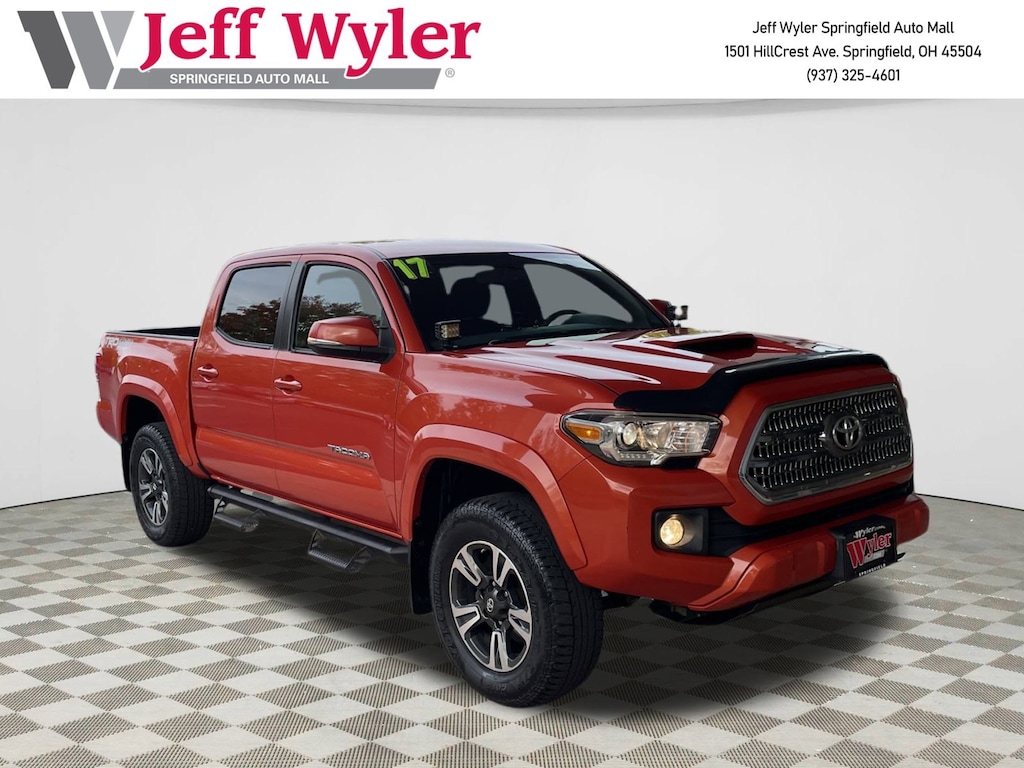 Jeff Wyler Springfield Auto Mall is pumped up to offer this superb-looking 2017 Toyota Tacoma TRD Sport in Burnt Orange. Well equipped with: ABS brakes, Air Conditioning, Alloy wheels, Compass, Electronic Stability Control, Illuminated entry, Low tire pressure warning, Remote keyless entry, Traction control, 120V/400W Deck Mounted AC Power, 6 Speakers, AM/FM radio: SiriusXM, Anti-whiplash front head restraints, Auto-Dimming Inside Rear-View Mirror w/Compass, Auto-dimming Rear-View mirror, Axle Ratio: 3.91, Brake assist, Bumpers: body-color, CD player, Color-Keyed Overfenders, Cruise Control, Driver door bin, Dual front impact airbags, Dual front side impact airbags, Engine Immobilizer, Exterior Parking Camera Rear, Fabric Seat Trim (FD), Front anti-roll bar, Front Bucket Seats, Front Center Armrest, Front fog lights, Front reading lights, Front wheel independent suspension, Knee airbag, Leather Shift Knob, LED Daytime Running Lights, Occupant sensing airbag, Outside temperature display, Overhead airbag, Overhead console, Panic alarm, Passenger door bin, Power door mirrors, Power Sliding Rear Window w/Privacy Glass, Power steering, Power windows, Radio: Entune Premium w/AM/FM/CD/Nav/App Suite, Rear step bumper, Remote Keyless Entry System, Security system, Smart Key w/Push Button Start, Speed control, Speed-sensing steering, Split folding rear seat, Steering wheel mounted audio controls, Tachometer, Telescoping steering wheel, Tilt steering wheel, Trip computer, Turn signal indicator mirrors, Variable Intermittent Wipers, Variably intermittent wipers, Wheels: 17" x 7.5" Machined Alloy, and Wide Angle Front Fog Lamps. Awards: * 2017 KBB.com Best Resale Value Awards * 2017 KBB.com 10 Most Awarded Brands Ask about available certifications. Used vehicles 10 years of age or newer with less than 100,000 miles are eligible for the Wyler Assurance Program, but eligible vehicles must pass our reconditioning process and multi-point inspection. Provided the vehicle passes inspection, vehicles will be eligible for the 6 month/6,000 mile limited warranty. The 6 month/6,000 mile limited warranty is NOT available on AS-IS vehicles, wholesale vehicles, lease buyback/pass-thru vehicles or un-inspected vehicles. Note that this program can also apply to vehicles where the remaining factory coverage is less than 6 months or 6,000 miles. Please check the Federal Trade Commission (FTC) Buyers guide on the vehicle for full details as to whether or not warranty coverage may apply. Contact Dealer for additional details. The Wyler Assurance 6 month/6,000 Mile limited warranty ends 6 months from the date of the Retail Purchase Agreement (BUYERS ORDER) or when the vehicle's odometer registers 6,000 additional miles to the mileage listed on the BUYERS ORDER, whichever comes first. Your Deductible - The warranty holder on your contract pays the first $100 of each covered repair.