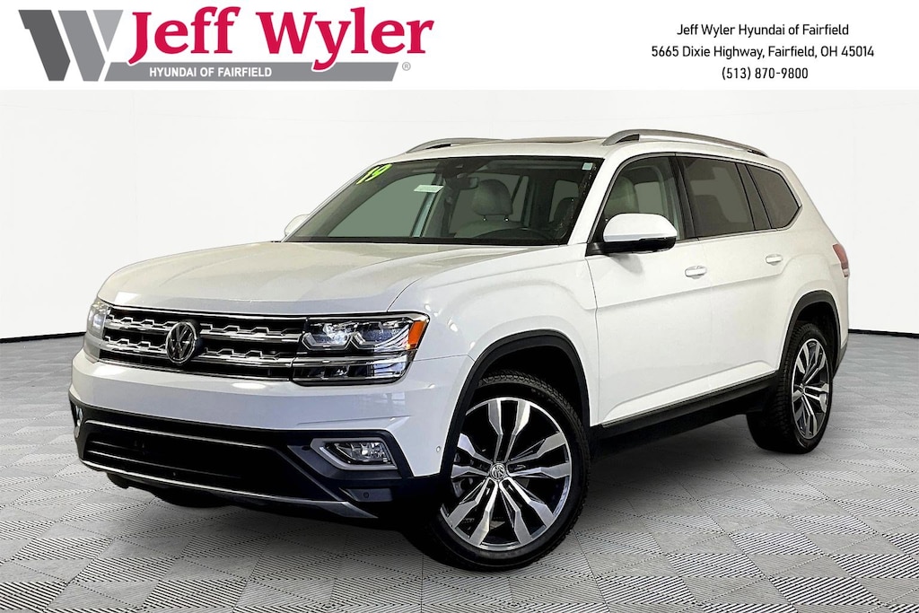 Clean CARFAX. Jeff Wyler Hyundai of Fairfield is pumped up to offer this beautiful 2019 Volkswagen Atlas SEL Premium in Pure White. Well equipped with: Android Auto, Apple CarPlay, CALL NOW FOR YOUR VIP APPOINTMENT 513-870-9800, FULLY SERVICED w/RECORDS, GUARANTEED FINANCING!! NO MATTER YOUR SITUATION WE CAN GET AN APPROVAL!!, THE #1 Volume dealer in the region! Come see why for yourself Today!!, WE PAY MORE FOR YOUR TRADE!!, 12 Speakers, 3.60 Axle Ratio, 3rd row seats: split-bench, 4-Wheel Disc Brakes, ABS brakes, Active Blind Spot Monitor, Air Conditioning, Alloy wheels, AM/FM radio: SiriusXM, Auto High-beam Headlights, Auto-dimming Rear-View mirror, Automatic temperature control, Brake assist, Bumpers: body-color, Compass, Delay-off headlights, Driver door bin, Driver vanity mirror, Dual front impact airbags, Dual front side impact airbags, Electronic Stability Control, Emergency communication system: VW Car-Net services (capabilities require enrollment or subscription), Forward collision: FCW w/Autonomous Emergency Braking mitigation, Four wheel independent suspension, Front anti-roll bar, Front Bucket Seats, Front Center Armrest, Front dual zone A/C, Front fog lights, Front reading lights, Garage door transmitter: HomeLink, Heated door mirrors, Heated front seats, Heated rear seats, Heated steering wheel, Htd/Actively Ventilated Comfort Front Bucket Seats, Illuminated entry, Low tire pressure warning, Memory seat, Navigation System, Occupant sensing airbag, Outside temperature display, Overhead airbag, Overhead console, Panic alarm, Passenger door bin, Passenger vanity mirror, Perforated Vienna Leather Seating Surfaces, Power door mirrors, Power driver seat, Power Liftgate, Power moonroof, Power passenger seat, Power steering, Power windows, Radio data system, Radio: Discover Media 8.0" Touchscreen w/Nav, Rain sensing wipers, Rear air conditioning, Rear anti-roll bar, Rear audio controls, Rear reading lights, Rear seat center armrest, Rear window defroster, Rear window wiper, Remote CD player, Remote keyless entry, Roof rack: rails only, Security system, Speed control, Speed-sensing steering, Split folding rear seat, Spoiler, Standard Suspension, Steering wheel mounted audio controls, Tachometer, Telescoping steering wheel, Tilt steering wheel, Traction control, Trip computer, Turn signal indicator mirrors, Variably intermittent wipers, Ventilated front seats, and Wheels: 20" Silver Triple 5-Spoke Alloy. TO CHECK ON THE AVAILABILITY OF THIS VEHICLE REACH OUT TO ONE OF OUR TEAM MEMBERS!! ALSO SHOP ONLINE AT https://www.jeffwylerhyundaioffairfield.com/ Proudly Serving: Cincinnati, Dayton, Columbus, Louisville, Lexington, Indianapolis, Hamilton, Florence, Alexandria, Beavercreek, Springdale, West Chester, Monroe, Fairfield, Kenwood, Newport and all of greater Cincinnati Ohio, Indiana, and Northern Kentucky.